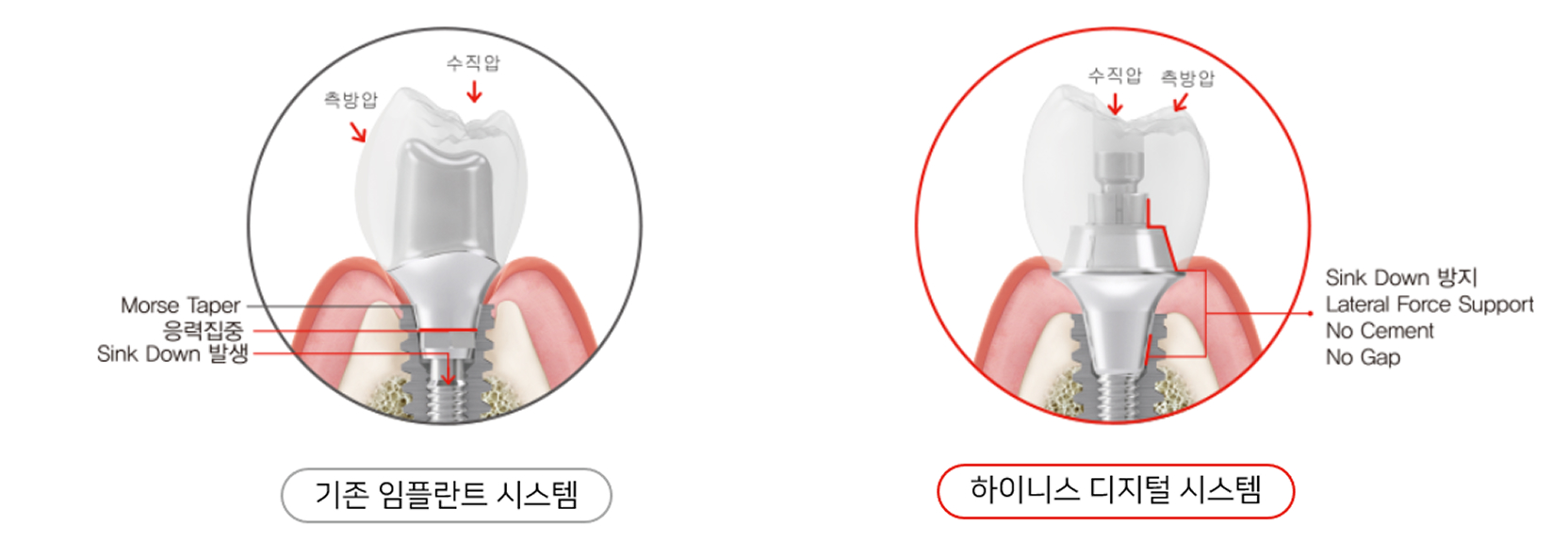 | 시멘트 사용 | Cement로 인한 임플란트 주위염 발생 가능 | Cement 사용하지 않아 잔존 Cement로 인한 부작용과 합병증이 없음 |
