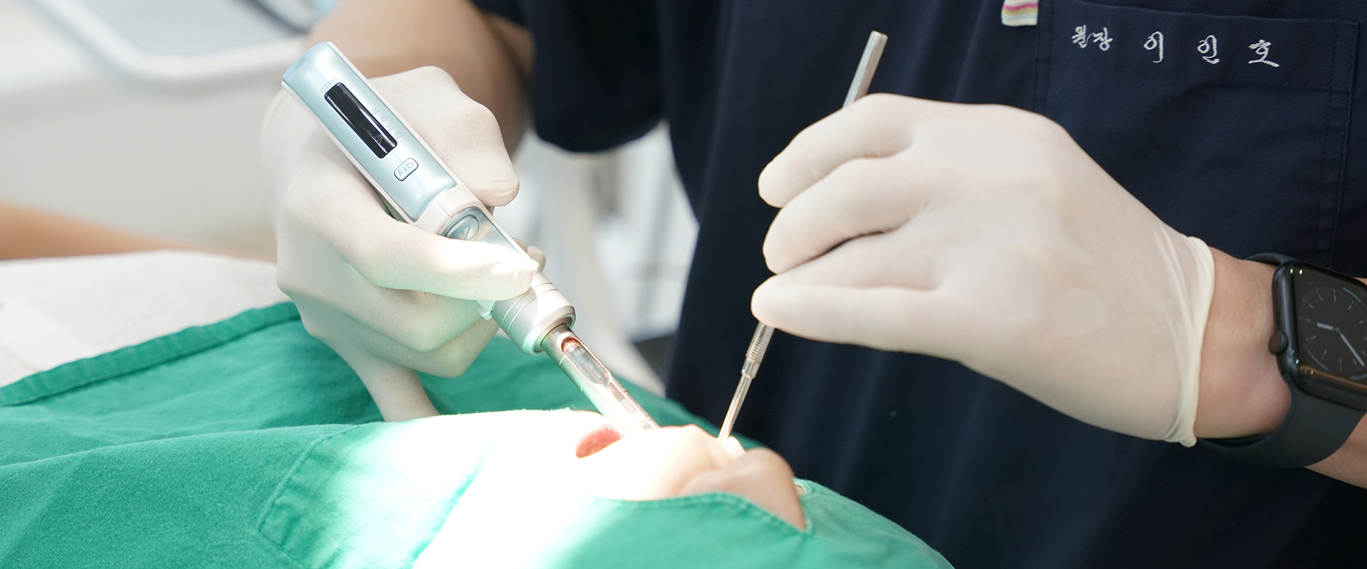 단점 : 직접 눈으로 확인하기 어려우며, 잇몸이 불규칙해 기구 접근이 어려우면 시술 불가합니다.